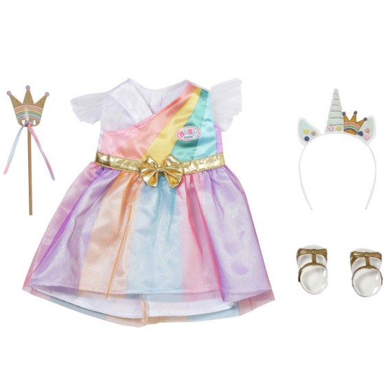 Prześliczny strój księżniczki Baby Born z bajkowej krainy! Do tęczowej sukni dołączona została magiczna złota różdżka, opaska i złote sandałki. Wyjątkowy strój dla wyjątkowej lalki.