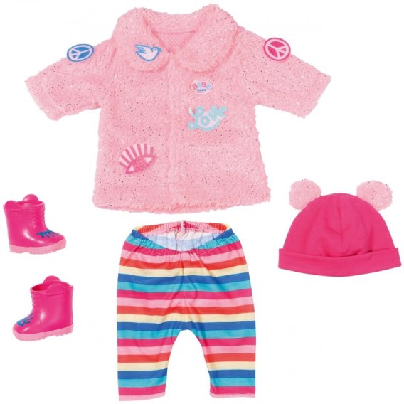 BABY Born wygląda naprawdę uroczo w nowym kompleciku od Zapf Creation. Zimne dni nie stanowią już żadnego problemu dla małej mamy. Modne oraz ciepłe ubranie dla Twojej laleczki sprawdzi się z pewnością podczas spacerów czy zabaw w parku. Różowy płaszczyk, do tego wygodne i zapewniające nogom wystarczająco dużo swobody, spodnie w kolorowe paski. W komplecie znajdują się również buciki, czapeczka oraz wieszaczek. Taki komplet zachwyci każdą dziewczynkę!
