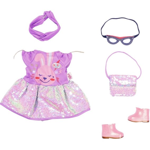 Urodzinowe Ubranka dla lalkiBaby Born o wysokości43 cm od firmyZapf Creation, cenionego producenta zabawek dla dzieci, z pewnością będą stanowiły idealne uzupełnienie garderoby. Zestaw składa się z 5 elementów zawierających różowe buciki, błyszczącą różową z cekinami torebeczkę, fioletowąsukieneczkę z króliczkiem pokrytą cekinami, okulary oraz fioletową opaskę.