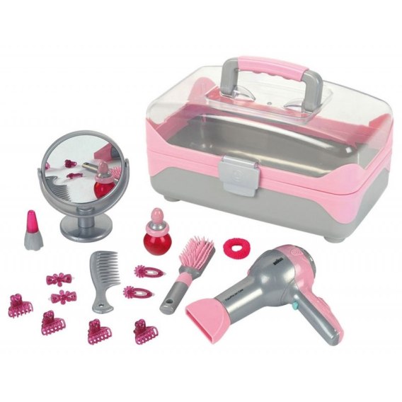 Zestaw fryzjerski - Różowo szara walizka fryzjerska z akcesoriami na licencji Braun, od firmy Klein, cenionego producenta zabawek dla dzieci, to idealny pomysł na prezent. Taki zestaw to doskonała zabawa dla dziewczynek, które chcą wczuć się w rolę prawdziwej fryzjerki. Zabawka jest bardzo solidna, wykonana z wysokiej jakości tworzywa z dbałością o każdy szczegół.