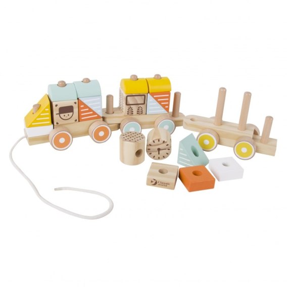 CLASSIC WORLD Drewniany Pociąg do Ciągnięcia to piękny, solidnie wykonany produkt, który ucieszy każdego malucha. Zabawka pobudzakreatywność oraz wyobraźnie! Nasza pociecha może w dowolny sposób zaprojektować pociąg z dołączonych klocków i wyruszyć w podróż nim. Pastelowe kolory przykują uwagę każdego małego podróżnika! Produkt składa się z 16 klocków, oraz z trzech wagonów, które w dowolny sposób można łączyć i ustawiać. Zabawka rozwija koordynację ruchu dziecka i ciekawość poznawania świata. Przeznaczony dla dzieci powyżej 10 miesiąca życia.