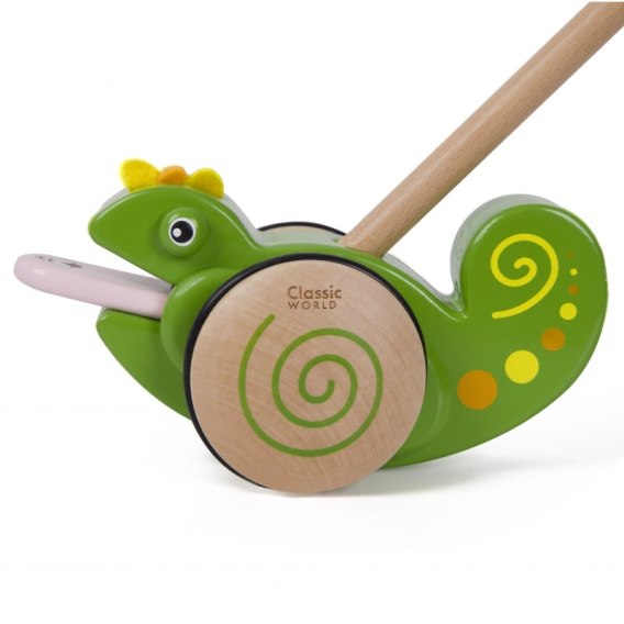 Drewniana zabawka do pchania marki Classic World. Dzieci mogą ćwiczyć chodzenie, prowadząc przed sobą ulubioną zabawkę. Podczas jeżdżenia, kameleon wysuwa język i łapie muchę wydając przy tym dźwięk, powodując u maluszka śmiech i radość. Kameleon to bestsellerowa zabawka marki Classic World.