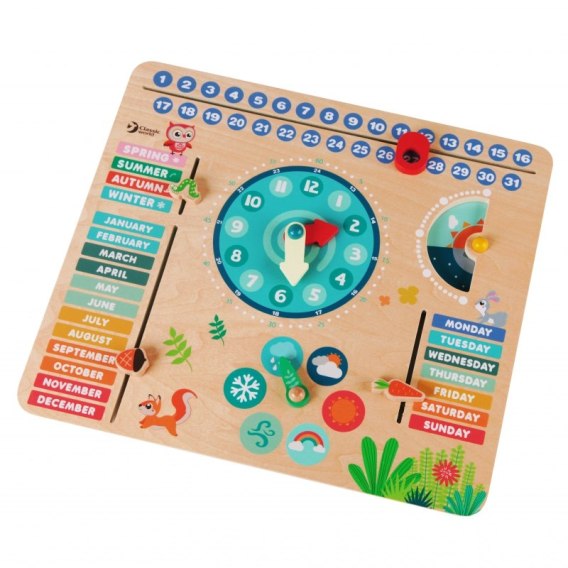 Edukacyjny Kalendarz od renomowanej marki Classic World to idealny produkt do nauki dat i dni tygodnia. Edukacyjna zabawka jest wykonana z wysokiej jakości drewna, pomalowanegonie toksycznymi farbami bezpiecznymi dla dzieci. Kalendarz posiada zaznaczaniednia tygodnia i miesiąca, nazwę miesiąca, godzinę, pogodę oraz porę dnia. Dziecko możezabrać kalendarz w podróż i na bieżąco ustawiać warunki pogodowe za oknem.