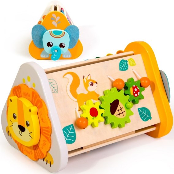 Kostka Edukacyjna 3w1 Interaktywne Pudełko Aktywności pudełko marki Classic World to wykonana z drewna zabawka, która dostarczy mnóstwo rozrywki Twojemu dziecku. Zabawka gra muzykę dżungli, co niezwykle podoba się każdemu maluchowi. Posiada mnóstwo funkcji: cymbałki, gra w nawigatora, zabawa kołami zębatymi. Świetna wielofunkcyjna zabawka dla dzieci w formie pudełka. Drewniane pudełeczko utrzymane jest w konwencji dżungli, więc możemy na nim dostrzec na przykład podobiznę króla dżungli - groźnego lwa! Zabawka wyposażona została w wiele genialnych funkcji, dzięki którym nie znudzi się dzieciom zbyt szybko.
