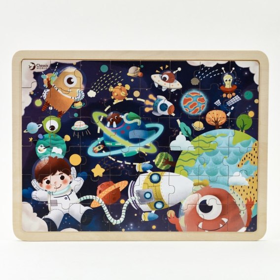 Classic World Drewniane Puzzle Kosmos-zestaw zawiera 48 elementów. Elementy układanki mieszczą się wygodnej ramce. Szczegółowe ilustracje z żywymi efektami pobudzają wyobraźnię malucha podczas układania elementów. Zobacz jak bohaterzy wypływają w podróż kosmiczną układając kolejne elementy układanki!