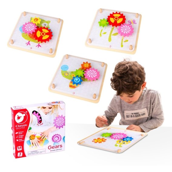 Świetny pomysł na kreatywną zabawkę dla dziecka. Kolorowe, drewniane przekładnie mogą być układane i aranżowane na wiele różnych sposobów.Każdy obrazek to nowe możliwości.Zasada jest jedna koła powinny się wzajemnie nakręcać. Uzyskujemy fantastyczny obrazek który jest jednocześnie konstrukcją uczącą zasad mechaniki.