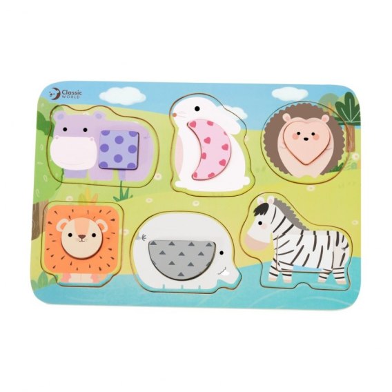 Drewniane Kolorowe Klocki od Classic World dla dzieci od 12 miesiąca życia to idealne rozwiązanie do domu, jak i do przedszkola. Składa się z planszy na której jest 6 kolorowych klocuszków ze zwierzątkami, oraz plansza. Do każdej planszy trzeba odpowiednio dopasować element tak by powstał cały obrazek. Na drewnianej podstawce znajdują się wgłębienia, które swoim kształtem odpowiadająkolorowym puzzlom. Dzięki zabawce dziecko rozwija koordynację wzrokowo-ruchową.