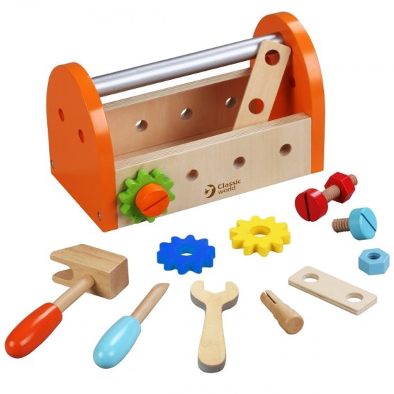 Drewniany Zestaw Narzędzi Classic World to świetny pomysł na prezent dla każdego małego majsterkowicza. Od teraz każdy maluch będzie miał wszystko co mu potrzebne do reperowania, skręcania, zbijania i wszelkich prac remontowych. Maluch wreszcie będzie mógł pomagać tacie w domowych pracach. Zestaw został wykonany z myślą o małych rączkach dziecka. Brak ostrych krawędzi sprawia, że jest bezpieczny dla dziecka. Zegar wykonany z wysokiej jakości drewna. Frajda z zabawy gwarantowana!