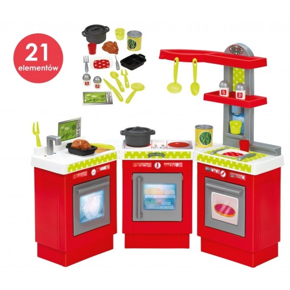 Ecoiffier Trójmodułowa kuchnia + akcesoria to rewelacyjna, duża kuchnia renomowanej, francuskiej marki Ecoiffier składająca się z trzech modułów. Nasza pociecha będzie mogła wcielić się w prawdziwego kucharza. Piękny, czerwony zestaw przyciągnie wzrok każdego malucha. Zestaw jest na tyle duży, że pozwala na zabawę paru osób. Kuchnie można ustawić na trzy różne sposoby w zależności od wyglądu pokoju czy też pomysłu malucha. Wiele godzin zabawy gwarantowany. Teraz to maluch będzie gotować pyszne posiłki dla całej rodziny!