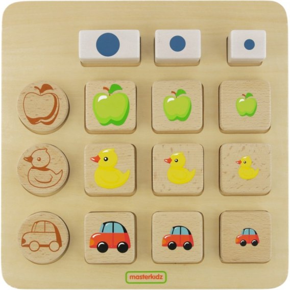 Zabawka składa się z drewnianej planszy z wycięciami, oraz 15 klocków różnego rodzaju. 3 okrągłe klocki odpowiadają za rodzaj układanego kształtu w rzędzie, prostokątne klocki ustalają rozmiar obiektu w kolumnie poniżej, a sześcienne klocki z grafikami dziecko ma za zadanie ułożyć w odpowiedni sposób na ustalonej planszy.