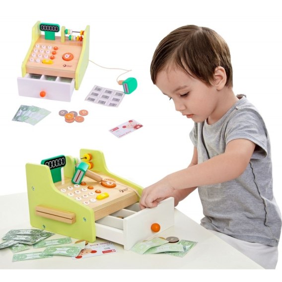 Kasa sklepowa marki Classic World to świetna drewniana zabawka, która pozwoli na odegranie wielu scenek, jakie mogą mieć miejsce w sklepie. Dzieci mogą wcielić się w role kasjera, lub klienta, oraz wspólnie ćwiczyć interakcje społeczne, oraz swoje zdolności komunikacyjne. Gotówka, czy karta? Policz sumę należności, przyjmij pieniądze i wydaj poprawnie resztę. Kasa zawiera banknoty, monety, oraz kartę płatniczą. Dziecko może uczyć się bawiąc! Królowa Nauk - matematyka nie będzie już straszna.