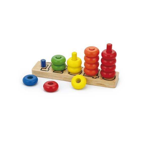 Piramida - licz kolorami od firmy Viga to idealny prezent dla dziecka - który wspomoże edukację. Nauka kolorów, liczenia a także koordynację ruchową. Zabawka posiada podstawę na której przypisane są miejsca za pomocą cyfr przy których znajdują się kołeczki. Zadaniem dziecka jest ułożenie koralików tak aby odpowiednia ich liczba-zgodna z cyfrą opisaną na podstawie znalazła się na kołeczkach. Każdy słupek ma kolor zgodny z koralikami- co ułatwi dziecku dopasowanie ich.