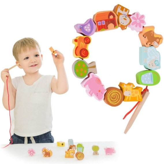 Przeplatanka dla dzieci utrzymana została w motywie farmy. Zabawka przeplatana marki Classic World to klasyczny zestaw drewnianych elementów z dziurkami, przez które dziecko przeplata sznureczek. Jest to świetna zabawa, która rozwija zręczność, oraz wzbudza ciekawość dziecka na temat farmy - zwierzątek, traktorków itp.