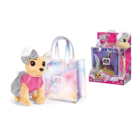 Piesek z uwielbianej przez dzieci serii Chi Chi Love z śliczną, lśniącą torebką to idealna zabawka dla małych miłośniczek piesków i mody. Chihuahua jest milutka w dotyku i nie sposób powstrzymać się by jej nie pogłaskać. Na uszku ma piękną srebrną kokardkę i ubrana jest w błyszczący, modny strój: różową bluzeczkę i srebrną spódniczkę. Największym hitem jest holograficzna, transparentna torebka! Najmodniejsza w tym sezonie! Pomieści ona naszego uroczego pupila i inne ulubione akcesoria małej królowej mody.