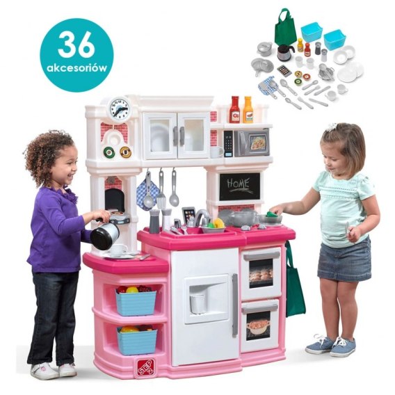 Mali kucharze będą zachwyceni gotowaniem w tej kuchni wyprodukowanej przez renomowaną firmę Step2. Zabawka jest w kolorze ciemnoróżowym z nowoczesnymi białymi szafkami z oknami i podwójnymi piekarnikami, idealnymi do przygotowywania wykwintnych smakołyków. Dzięki tej kuchni nasze maluchy mogą w pełni naśladować dorosłych zarówno w gotowaniu jak i sprzątaniu. Użyj telefonu aby zaprosić znajomych na przyjęcie, isprawdź na tablicy czy wszystkie zakupy są zrobione. Przygotuj danie główne z interaktywną płytą kuchenną która posiada realistyczne dźwięki i światła podczas gotowania. Zaparz kawę dla gości oczekujących na rozpoczęcie kolacji, korzystając z dołączonego ekspresu do kawy. Kiedy zabawa się skończy, zmyj naczynia w zlewozmywaku i odkładaj wszystko do pojemników do przechowywania.