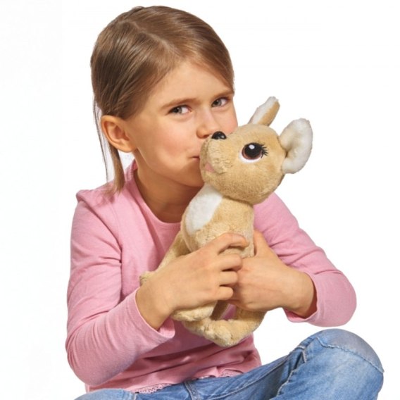 Piesek Chi Chi Love zaprojektowany przez niemiecką firmę Simba.wykonany z beżowego, miękkiego pluszu, dzięki temu jest milutki w dotyku. Ma na sobie słodką różową sukienkę w białe serduszka, które świecą w ciemności. W zestawie znajduje się także różowa modna torebka. W torebce dziewczynki mogą przenosić swojego pieska lub inne własne akcesoria. Piesek zapewne w krótkim czasie stanie się ulubionym towarzyszem. Dzięki gustownej torebce Nasza pociecha może zabrać go ze sobą w najdalszy zakątek świata Piesek stanie się idealnym towarzyszem podróży.