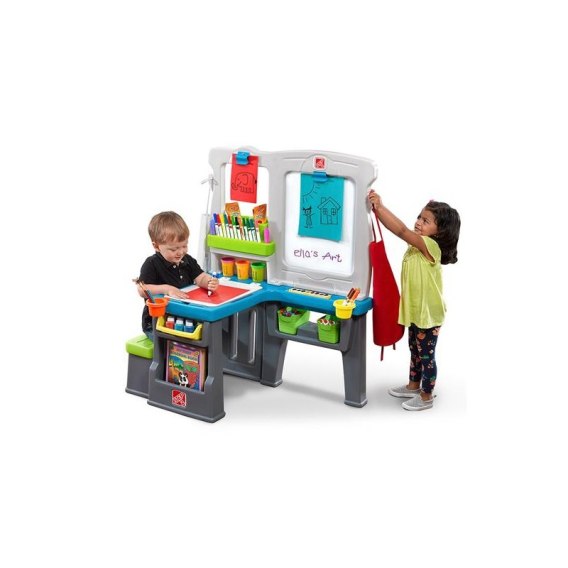 - - To w pełni wyposażone stanowisko do malowania dla dzieci z mnóstwem miejsca do przechowywania sprawia, że zapasy są dostępne dla każdego, bez względu na stanowisko, na którym pracują - w tym uformowane haczyki do wieszania fartuchów!