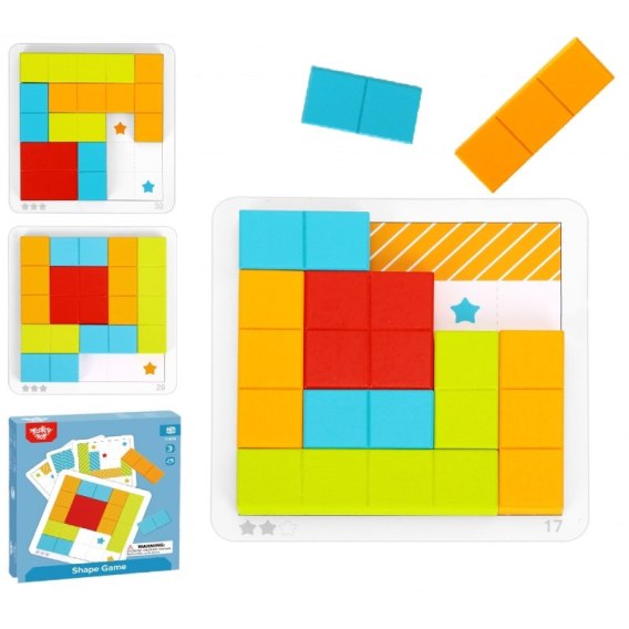 - W zestawie 25 elementów: kolorowe klocki różnej wielkości oraz plansze do gry.
