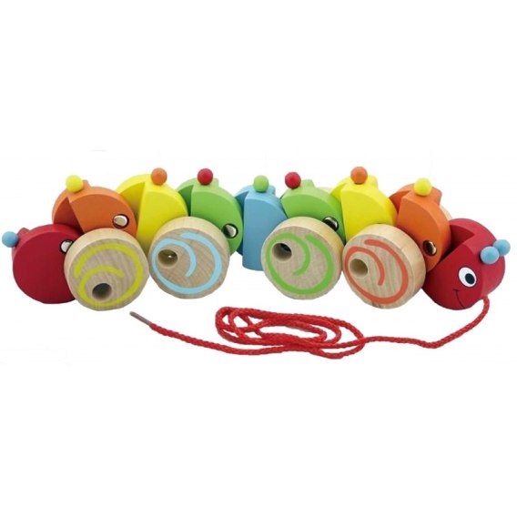 Kolorowa, drewniana stonoga od firmy Viga. Wszystkie elementy stonogi połączone są ze sobą sznureczkiem. Dziecko podczas stawiania pierwszych kroków ciągnie za sobą stonogę, która porusza się w zabawny sposób i wydaje dźwięki.