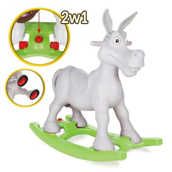 Osiołek na biegunach to idealna zabawka dla dzieci od 3 roku życia. Podstawową jego funkcją jest bujak. Dodatkowo po wypięciu osiołka z podstawy, dzięki zamontowanym w nóżkach kółkom, pełni funkcję jeździka. Elastyczne uszy osiołka dają poczucie bezpieczeństwa.