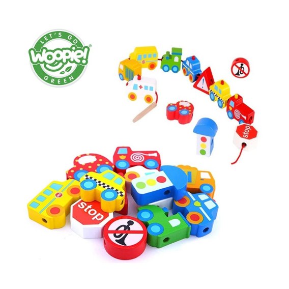 Klocki Koraliki Do Nawlekania Pojazdy Samochody od markiWOOPIE z seriiGREEN to idealna zabawka do rozwijania umiejętności manualnych dziecka. Przeplatanka dla dzieci utrzymana została w motywie pojazdów. Nawlekanka to klasyczny zestaw drewnianych klocków z dziurkami, przez które dziecko przeplata sznureczek. Jest to świetna zabawa, która rozwijazdolności manualne tzw. "małą motorykę", koordynację ręka-oko, wspomaga koncentrację oraz wzbudza ciekawość dziecka na temat pojazdów i znaków drogowych!