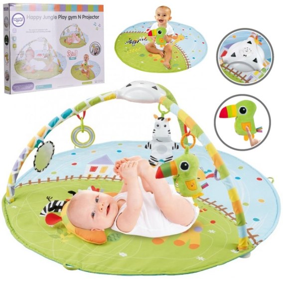 WOOPIE Interaktywna Mata Edukacyjna dla Dzieci z projektorem wpływa pozytywnie na rozwój wszystkich zmysłów u niemowlaka. Nasza mata to świetne miejsce na relaks, zabawę i odkrywanie świata. Mata dla najmłodszych dzieci o średnicy aż 104 cm ze zwierzaczkami jest idealna dla każdego malucha. Posiada odczepianą pozytywkę z projektorem. Można jej używać razem z matą lub osobno. Do wyboru mamy 8 uspokajających melodii, natomiast projektor wyświetla na suficie gwiazdki i księżyc. W zestawie znajdują się4 zabawki (zieloną papugę z efektami muzycznymi po przyciśnięciu skrzydełka, zebrę, lusterko, obręcz), które pobudzają wszystkie zmysły. Można podwiesić je na pałąkach lub zastąpić innymi zabawkami. Mata jest bardzo łatwa w montażu oraz w czyszczeniu. Miękkie wypełnienie zwiększa poczucie komfortu. Produkt przeznaczony dla najmłodszych dzieci już od 1 miesiąca życia.