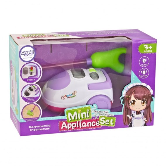 Elektryczny odkurzacz dla dzieci od renomowanej marki Woopie, który posiada funkcję ssania jest idealnym produktem dla małych gosposi. Odkurzacz wciąga styropianowe kulki dołączone do zestawu, które wpadają w pojemnik na śmieci. Pojemnik można otworzyć i opróżnić, a kuleczki ponownie wciągnąć. Sprzęt jest uruchamiany za pomocą przycisku umieszczonego na górnym panelu odkurzacza. Dodatkowo odkurzacz wydaje dźwięki podczas pracy i zapalają się lampki. Odkurzacz posiadawygodny uchwyt do przemieszczania sprzętu podczasodkurzania oraz wygodną giętką rurkę zamocowaną do szczotki.