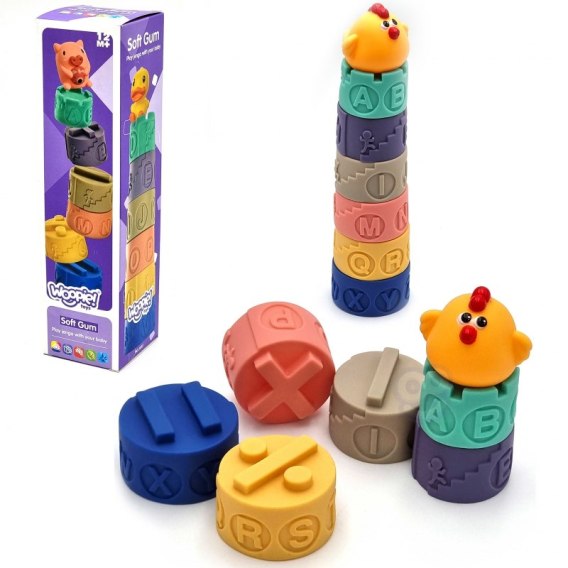 WOOPIE Układanka Klocki Sensoryczne zaciekawią każdego malucha. Dzięki ciekawym kształtom i kolorom doskonale stymulują rozwój koordynacji wzrokowo-słuchowej, motorycznej dziecka orazzmysłu dotyku. Klocki posiadają wypukłe kształty z znakami matematycznymi, teksturami/wzorami oraz wizerunkiem zwierząt. W zestawie znajduje się 7 elementów, w tym 6 klocków (z literami alfabetu oraz różnymi teksturami) do ułożenia w piramidę oraz klocek imitujący kurę. Klocki można ze sobą łączyć w wieżę. Zabawa polega na tym, że dziecko musi ułożyć wieże i umieścić na niej kurę, a pomoże mu w tym alfabet ponieważ klocki trzeba ułożyć zgodnie z kolejnością umieszczonych na nich liter. Klocki są miękkie i przyjemne w dotyku oraz wydają dźwięki podczas ściskania. Dzięki swojej budowie sprawdzą się również doskonale jako gryzak. Można używać i myć w wodzie. Klocki dodatkowo maja wartość edukacyjną jak nauka liczenia, dzięki możliwości wykonania prostych działań matematycznych. Produkt w pięknej stonowanej kolorystyce przeznaczony dla dzieci od 12 miesiąca życia.