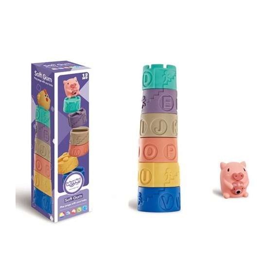 WOOPIE Układanka Klocki Sensoryczne zaciekawią każdego malucha. Dzięki ciekawym kształtom i kolorom doskonale stymulują rozwój koordynacji wzrokowo-słuchowej, motorycznej dziecka orazzmysłu dotyku. Klocki posiadają wypukłe kształty z znakami matematycznymi, teksturami/wzorami oraz wizerunkiem zwierząt. W zestawie znajduje się 7 elementów, w tym 6 klocków (z literami alfabetu oraz różnymi teksturami) do ułożenia w piramidę oraz klocek imitujący świnkę. Klocki można ze sobą łączyć w wieżę. Zabawa polega na tym, że dziecko musi ułożyć wieże i umieścić na niej świnkę, a pomoże mu w tym alfabet ponieważ klocki trzeba ułożyć zgodnie z kolejnością umieszczonych na nich liter. Klocki są miękkie i przyjemne w dotyku oraz wydają dźwięki podczas ściskania. Dzięki swojej budowie sprawdzą się również doskonale jako gryzak. Można używać i myć w wodzie. Klocki dodatkowo maja wartość edukacyjną jak nauka liczenia, dzięki możliwości wykonania prostych działań matematycznych. Produkt w pięknej stonowanej kolorystyce przeznaczony dla dzieci od 12 miesiąca życia.