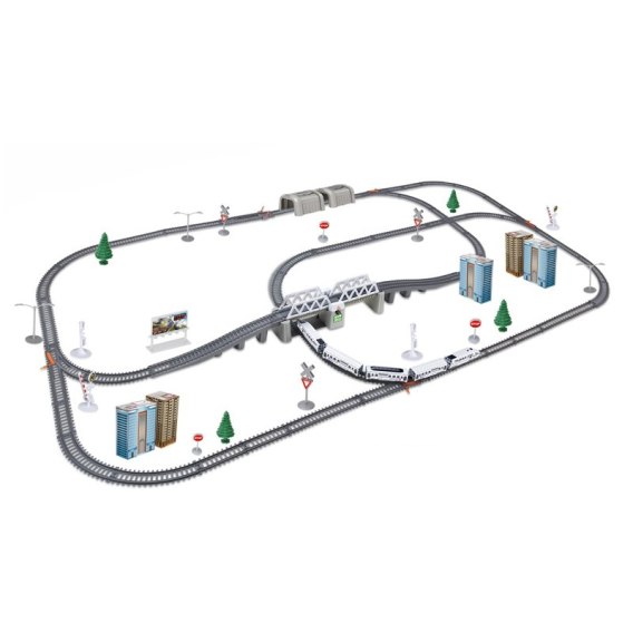 Pociąg Pendolino - 5-składowy, ruchomy, podnoszony most, Tunel kolejowy, znaki, atrapy budynków mieszkalnych, Szlabany, Drzewka, Latarnie.