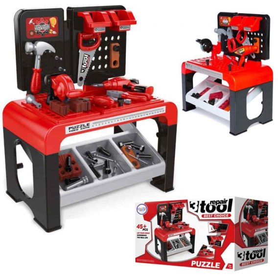 BOGATO WYPOSAŻONY WARSZTAT markiWOOPIE to świetny zestaw złożony z wielu elementów w dominującym kolorze czerwonym, solidne wykonany z dbałością o szczegóły. Dzięki niemu każdy może stać się profesjonalistą i ciąć, wiercić, skręcać i montować. Zestaw wyposażony został w wiele półek, szafek i wieszaków, na których można umieszczać narzędzia, a tym samym uczymy dziecko utrzymania porządku w miejscu zabawy i pracy. Dzięki tej zabawce Twoje dziecko zgłębi tajniki pracy w warsztacie i dodatkowo pozna do czego służą poszczególne narzędzia.