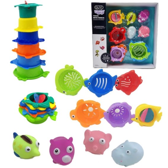 Zestaw zabawek wodnych od marki WOOPIE dostarczy super zabawę podczas kąpieli. Zestaw zawiera2 rodzaje rybek. Pierwsze (4 sztuki) to miękkie rybki figurki, które posiadają funkcję psikawki - naciśnij i zobacz jak strumień wylatuję z buzi rybki. Dziecko, również może użyć rybek kubeczków przelewowych (6 sztuk) do zabawy w wodzie. Pojemniczki można składać w jedno i ustawiać w wieżę oraz posiadają różne otwory w dnie - więc można przeprowadzić szereg różnych doświadczeń podczas kąpieli! Zestaw nie tylko umili czas podczas kąpieli, ale również rozwinie zdolności manualne u dziecka oraz rozwinie świadomość otaczającego go świata, a przede wszystkim pozwoli skoncentrować dziecko i zająć podczas mycia.