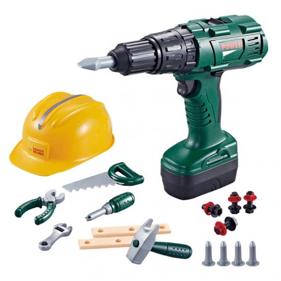 Zestaw narzędzi wraz z wiertarką/wkrętarką i kaskiem została stworzona przez  firmę WOOPIE. Te zabawkowe, całkowicie bezpieczne dla dzieci narzędzia powstały z wysokiej jakości materiałów. W skład zestawu wchodzi ciemno-zielona wiertarko-wkrętarka, kask oraz 18 elementów. Wkrętarka doskonale naśladuje prawdziwe urządzenie, dzięki dźwiękom oraz obrotowemu wkrętowi. Zasilana na baterie ztrzema wymienialnymi końcówkami. Ponadto w zestawie znajduje się piła z wygodnym uchwytem, śrubokręt, młotek, kombinerki, klucz francuski, dwie plastikowe deseczki z otworami do wkręcania śrub (4 w zestawie) lub wbijania gwoździ (4 w zestawie)oraz kask. Ten zestaw zapewni wspaniałą zabawę każdemu małemu majsterkowiczowi, wspomagając przy tym rozwój zdolności manualnych.