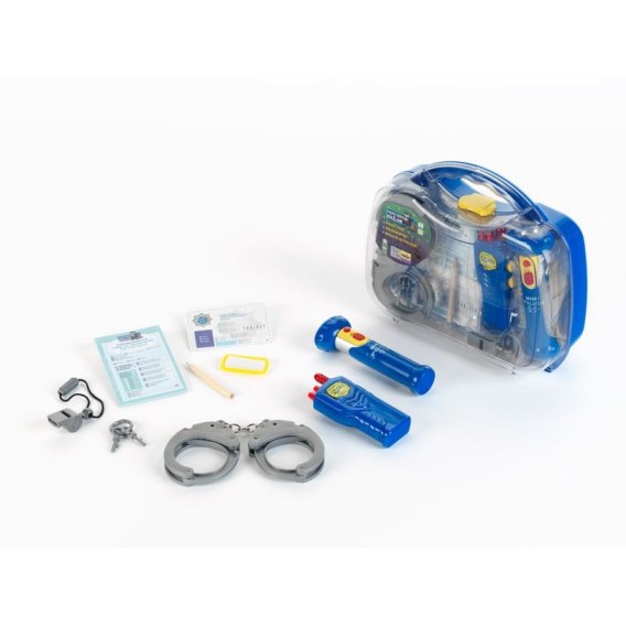 Duży zestaw policyjny w walizce Ben i Sam, od firmy Klein, cenionego producenta zabawek dla dzieci, z pewnością będzie stanowił idealne uzupełnienie stroju każdego policjanta. Wszystkie elementy zestawu znajdują się w zamykanej walizce wyposażonej w rączkę. Dzięki temu, że walizka jest przezroczysta dziecko może zobaczyć co znajduje się w środku bez jej otwierania.